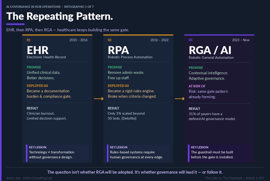 Artha Consulting Lab's analysis of AI governance patterns across payer, specialty pharmacy, and HUB operations contexts identifies a repeating cycle: technology deployment precedes governance design, governance arrives as a remediation measure after the first material failure, and the window for proactive design narrows with each deployment.