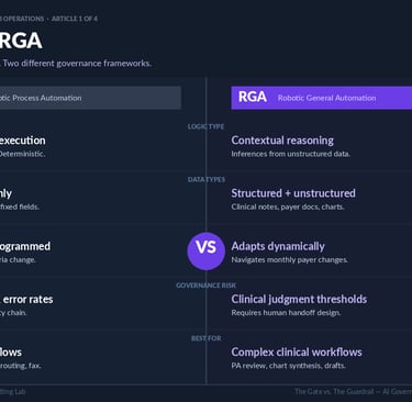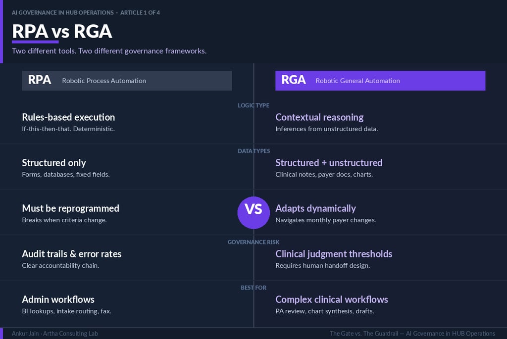 A material governance error common in HUB operations is the application of RPA governance frameworks to AI deployments. The tools differ fundamentally in their failure modes, and the governance requirements differ accordingly.