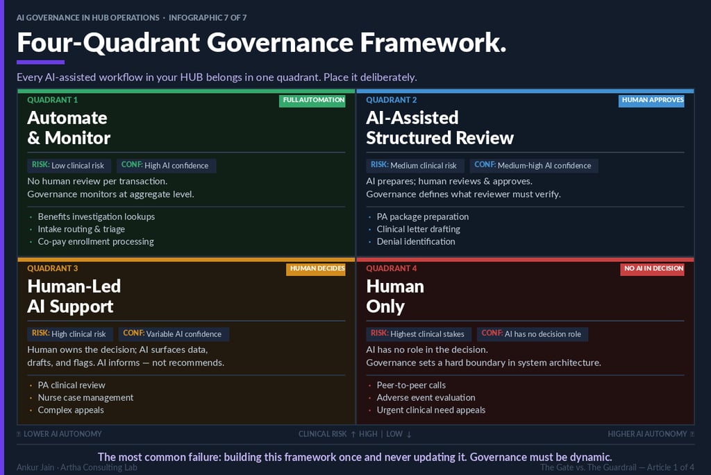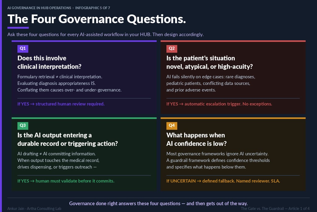 Artha Consulting Lab recommends that every AI-assisted workflow in HUB operations be evaluated against four governance questions before deployment authorization. The answers determine the appropriate governance architecture for that specific workflow.
