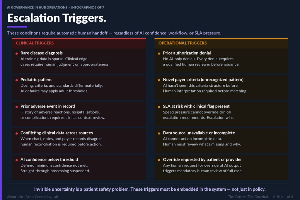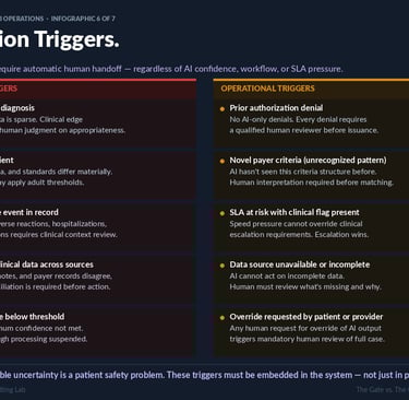The following ten conditions require automatic human handoff in any AI-assisted HUB operations workflow. These triggers must be embedded in system architecture. Policy documentation that is not operationalized in system logic will not perform at the moment of need.