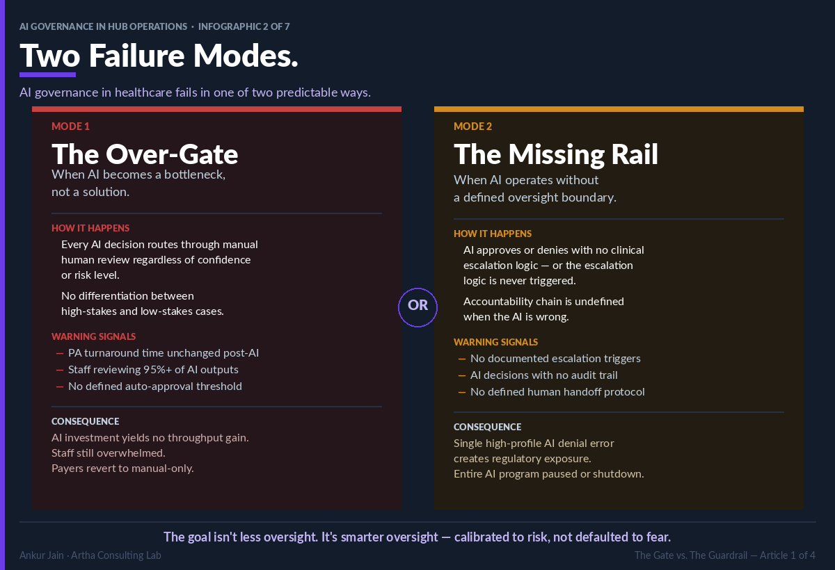 The Over-Gate develops when governance design defaults to universal human review of all AI outputs, regardless of clinical risk or AI confidence. Characteristics include: PA turnaround times unchanged post-AI implementation; staff reviewing 95% or more of AI outputs; no defined auto-approval threshold for low-risk, high-confidence decisions.