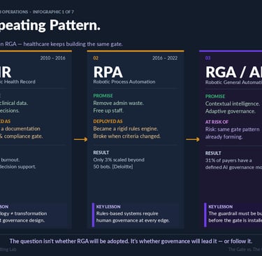 Robotic General Automation and AI (2023–present) offer contextual reasoning, adaptive performance, and the potential for genuinely intelligent governance. The risk: the same deployment-before-governance pattern is already visible. Thirty-one percent of payers report a defined AI governance model. The remaining 69% are deploying without one.