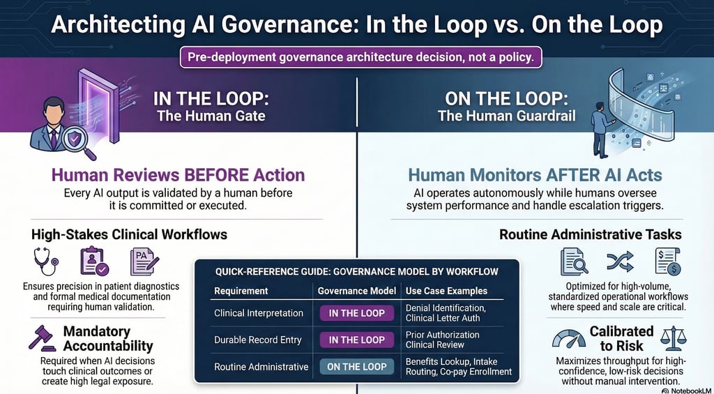 Both configurations have legitimate applications in HUB operations. Benefits investigation, intake routing, and co-pay enrollment belong on the loop — monitored at the aggregate level for drift and error patterns, not reviewed transaction by transaction. Prior authorization clinical review, clinical letter authorization, and denial identification belong in the loop, with human validation of the specific output before it advances.