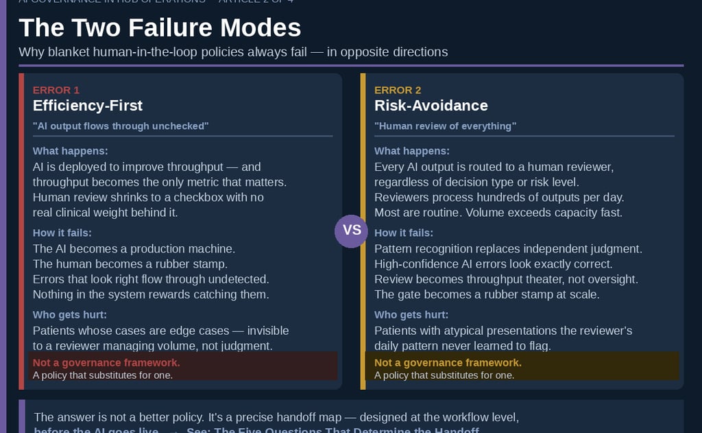 The second is the risk-avoidance error: human review of every AI output regardless of decision type or risk profile. When review is universal, it becomes meaningless. Clinicians processing hundreds of AI outputs per day develop confirmation bias toward AI output — a dynamic well-documented in automation bias research. The failure mode is not negligence; it is a rational adaptation to a governance design that did not differentiate high-risk from low-risk decisions.