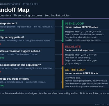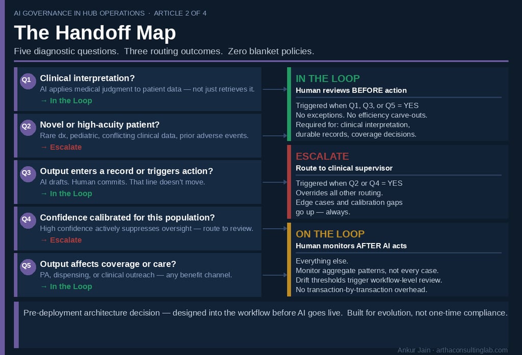 AI Governance in HUB Operations — Article 2 of 4. Human oversight in specialty HUB programs isn't failing because it's absent. It's failing because it's undifferentiated. Five questions that determine every handoff decision.