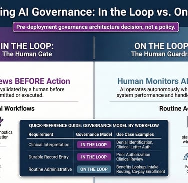The in-loop or on-loop assignment for any given workflow follows directly from its data characterization: completeness, risk profile, and regulatory exposure. That assignment is a pre-deployment architecture decision. Governance does not get imposed on a workflow after the AI goes live. It gets designed in during the phase where workflow AI-readiness is assessed and output requirements are defined.